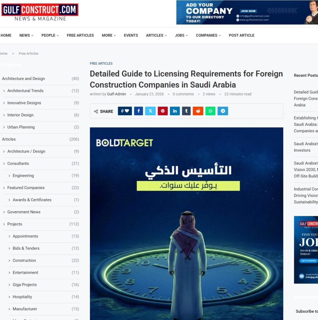 The article, published on Gulf Construct Magazine’s official website, focuses on regulatory, operational, and strategic developments in the Saudi construction sector, while also referencing Bold Target as an active and knowledgeable participant in the market. The full article can be accessed here: